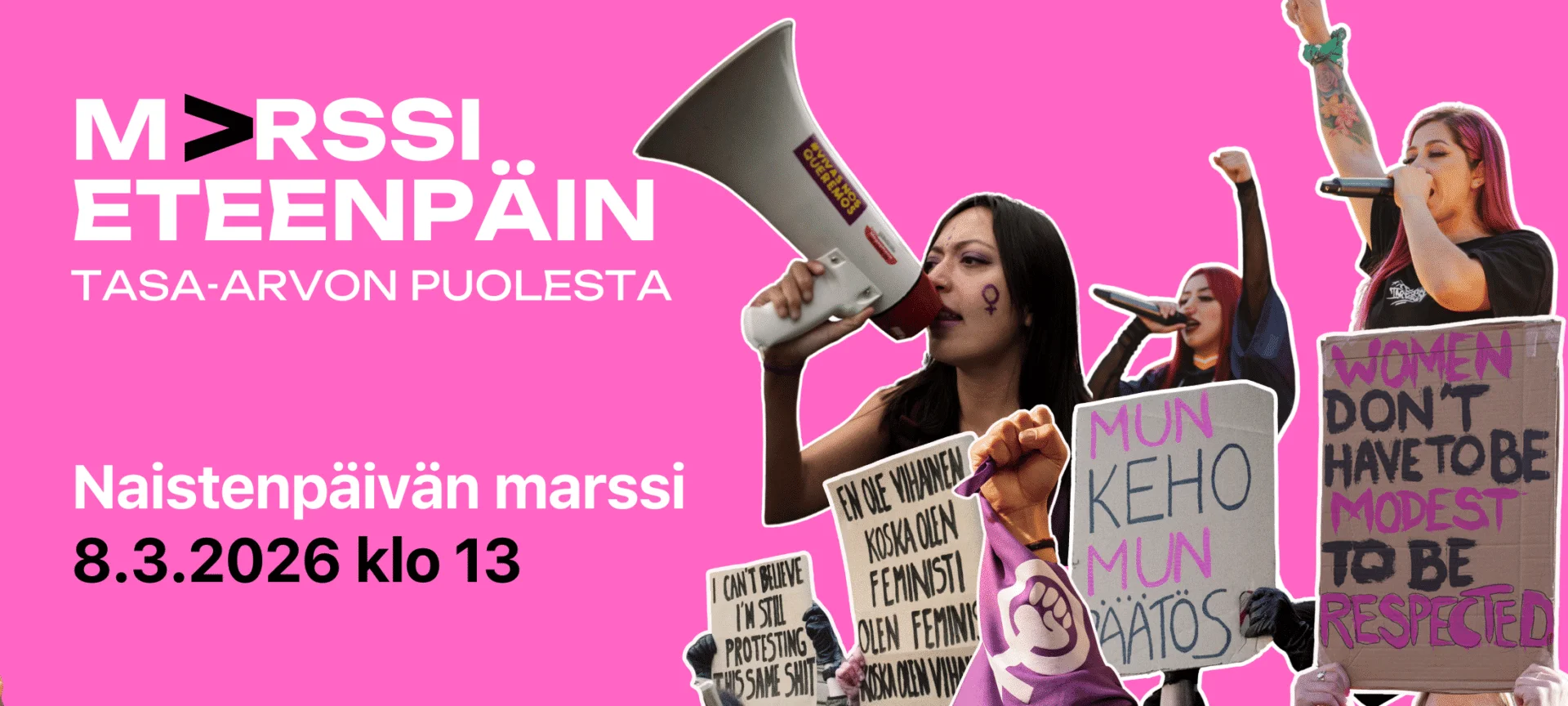 Kansainvälisenä naistenpäivänä 8.3.2026 kokoonnumme klo 13 Rautatientorille, ja marssimme jälleen halki Helsingin ja vaadimme, että tasa-arvoa ja naisten, tyttöjen ja vähemmistöjen oikeuksia on suojeltava ja edistettävä. Vaadimme suomalaisilta päättäjiltä konkreettisia tekoja sen varmistamiseksi, että jokainen nainen ja tyttö saa elää yhteiskunnassa, joka kunnioittaa ja puolustaa heidän oikeuksiaan ja ihmisarvoaan, ja jossa heidän ei tarvitse elää jatkuvassa väkivallan ja häirinnän pelossa.