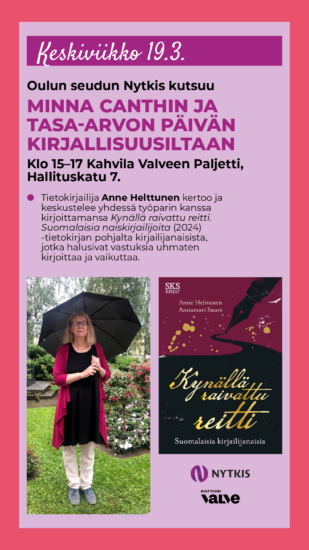 Oulun Seudun NYTKIS järjestää Minna Canthin ja tasa-arvon päivän kirjallisuusillan. Tietokirjailija Anne Helttunen kertoo ja keskustelee yhdessä työparin kanssa kirjoittamansa Kynällä raivattu reitti. Suomalaisia naiskirjailijoita (2024) -tietokirjan pohjalta kirjailijanaisista, jotka halusivat vastuksia uhmaten kirjoittaa ja vaikuttaa.