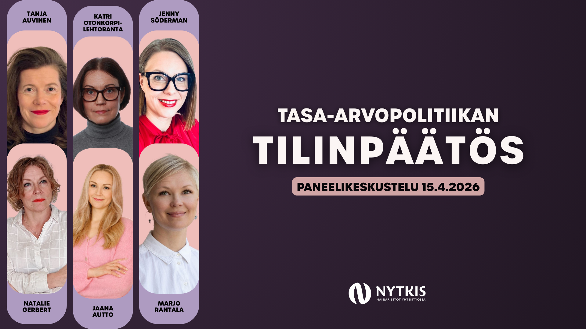 Eduskuntavaalit 2027 lähestyvät. Suomen asioista seuraavien neljän vuoden ajan päättävät 200 kansanedustajaa valitaan 18.4.2027 järjestettävissä eduskuntavaaleissa. Nyt on siis korkea aika tehdä meneillään olevan hallituskauden tilinpäätös tasa-arvopolitiikan osalta ja suunnata katseet vuoden päästä aloittavan hallituksen työhön tasa-arvon edistämiseksi! Naisjärjestöt Yhteistyössä NYTKIS ry järjestää keskiviikkona 15.4.2026 keskustelutilaisuuden Eduskunnan kansalaisinfossa klo 15.00–17.00. Tila on esteetön. Tapahtumassa kuullaan tasa-arvopolitiikan asiantuntijoiden näkemyksiä nykyisen hallituksen toimista tasa-arvon edistämiseksi ja lisäksi selvitetään, millaisia toimia keväällä 2027 muodostettavalta hallitukselta vaaditaan tasa-arvon […]